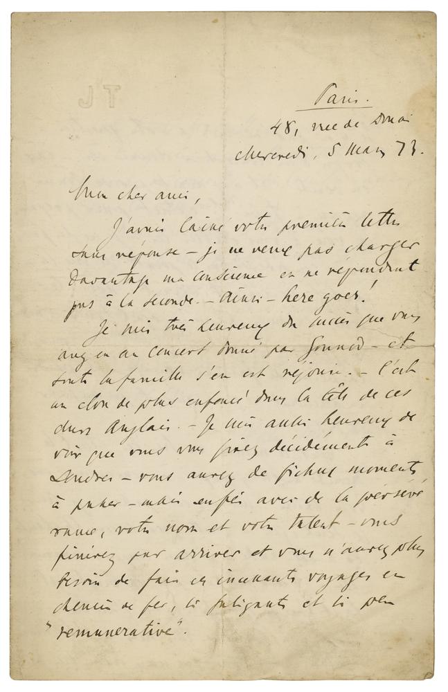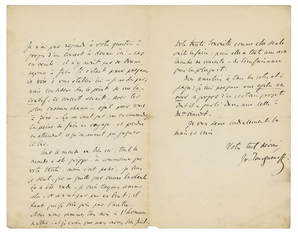 ALS in French, signed “Iv. Tourgueneff,” three pages on two adjoining sheets, 5.25 x 8.25, personal monogram letterhead, March 5, 1873. Handwritten letter, in part (translated): "I had hidden your first letter without responding—I don’t wish to burden my conscience any further by not responding to your second! So—here goes! I am very pleased about the success of the concert given by Gounod? It’s a further nail in the heads of these dear Englishmen. I am also pleased to see that you have finally decided to go to London. You will have great times? your name and your talent, you have finally arrived and you will no longer need to travel incessantly on the railways? I haven’t responded to your question regarding a concert here? if it was a way to begin to establish you here, I have no issue. But from a creative point of view the concert would be, with the greatest of respect, worth nothing to you. It’s not worth taking the trip just to see what could be gained here. Everyone has the flu here, starting with your aunt? I am the only one who doesn’t leave his room anymore. It was rude of me—I am always like that? We’ve all taken to homeopathy." Turgenev concludes by sending regards to his recipients ‘Papa,’ stating that he is preparing "an epistle in verse pertaining to a certain project I discussed with him in a letter to Madame Viardot." In fine condition, with light creasing and soiling to the bottom edge.