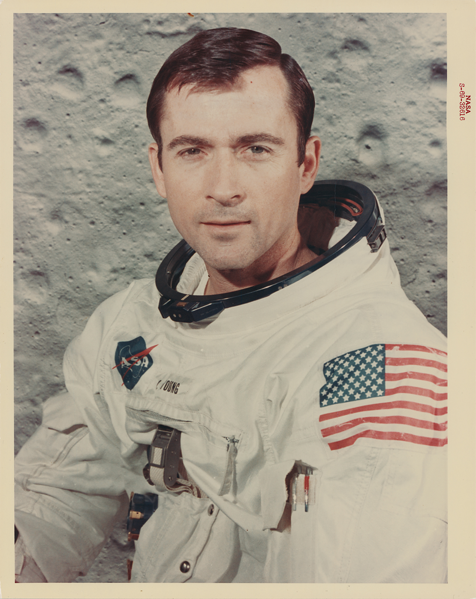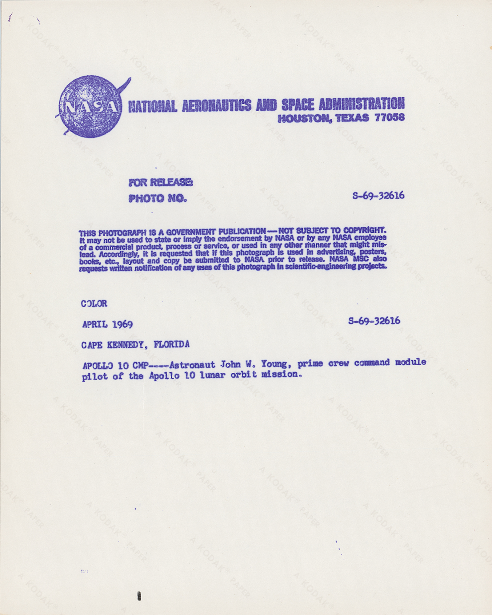 Official color glossy 8 x 10 red-numbered NASA photo (S-69-32616), showing Apollo 10 CMP John Young in his white spacesuit against a gray cratered lunar background. Reverse bears purple NASA caption text and "A Kodak Paper" watermarks. In very good to fine condition, with a vertical crease passing through Young's space suit and flag.