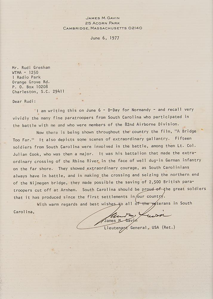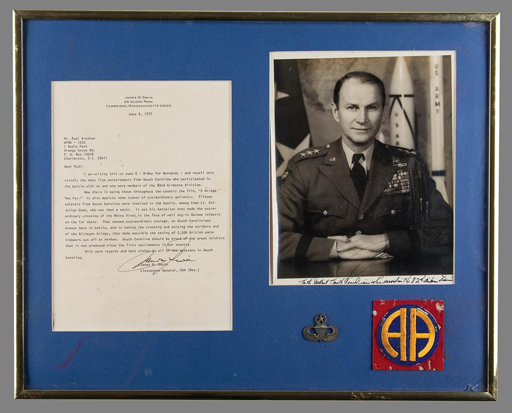 Two items: a TLS, signed “James M. Gavin,” one page, personal letterhead, June 6, 1977, in part: “I am writing this on June 6—D-Day for Normandy—and recall very vividly the many fine paratroopers from South Carolina who participated in the battle with me and who were members of the 82nd Airborne Division. Now there is being shown throughout the country the film ‘A Bridge Too Far.’ It also depicts some scenes of extraordinary gallantry. Fifteen soldiers from South Carolina were involved in the battle, among them Lt. Col. Julian Cook, who was then a major. It was his battalion that made the extraordinary crossing of the Rhine River in the face of well dug-in German infantry on the far shore. They showed extraordinary courage, as South Carolinians always have in battle, and in making the crossing and seizing the northern end of the Nijmegen bridge, they made possible the saving of 2,500 British paratroopers cut off at Arnhem. South Carolina should be proud of the great soldiers that it has produced since the first settlements in our country.” Also includes a glossy 7.5 x 9.75 photo of Gavin wearing his three-star Lieutenant General uniform, signed in black felt tip by Gavin, with an inscription below reading: “To the Gallant South Carolinians who served in the 82nd Airborn Division.” Both are matted with an 82nd Airborne Division patch and a Master Parachutist Badge badge to an overall size of 20.5 x 16.5. In overall very good to fine condition, with scattered light foxing to the letter, and speckled silvering to the photo.