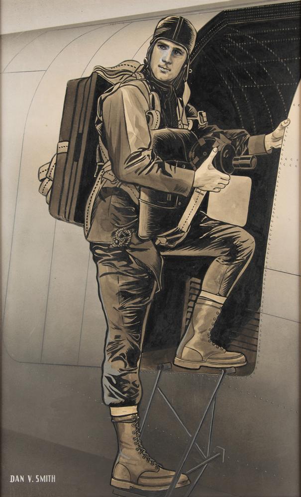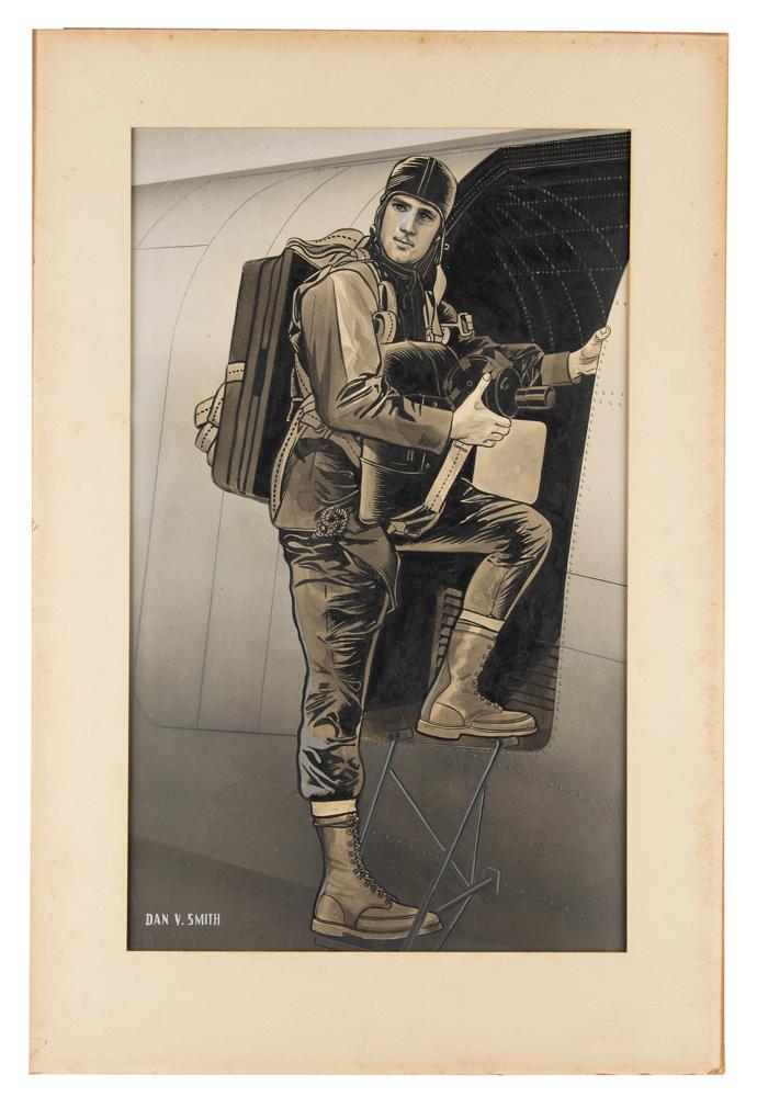 Impressive original artwork by Dan V. Smith of a United States Army parachutist in full uniform as he boards a military plane, expertly accomplished in graphite, ink, and watercolor on 10.25 x 17 drawing board, which is signed in the lower left in white paint, “Dan V. Smith.” Matted to a slightly larger size and in very good to fine condition, with toning end edge wear to the mat, not at all affecting the artwork itself.