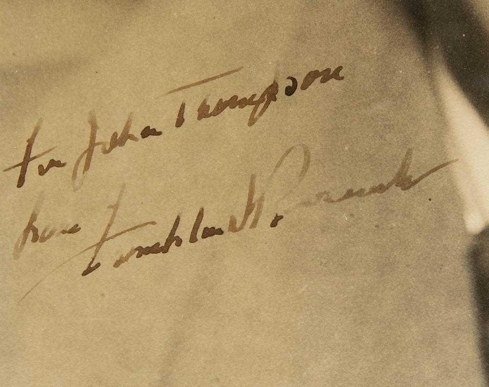 This classic image, popularly known as 'Smilin' Thru,' was well regarded as a great likeness of President Roosevelt. The recipient, John S. Thompson, covered the White House beat for Acme News Pictures throughout Roosevelt's presidency. Thompson's obituary discusses his close relationship with FDR: 'The late Franklin D. Roosevelt called Mr. Thompson 'my photographer' and he also called him by his first name, 'Johnny.' Mr. Thompson was said to have been the only photographer who followed Mr. Roosevelt's White House career straight through and traveled with the President on all his out-of-town trips.'