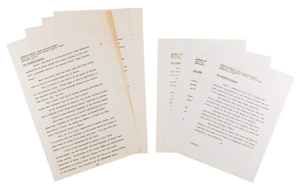 Group of press releases pertaining to the the “Texas Welcome Dinner” to be hosted for President John F. Kennedy at the Municipal Auditorium in Austin, Texas, on the night of the assassination, November 22, 1963, totaling seven pages, measuring from 8.5 x 11 to 8.5 x 14. The press releases supply the media with news pertaining to Kennedy's visit and promotes the sale of tickets to the dinner; one serves as a who's-who of the guest list, and the president's motorcade lineup is furnished as well. In fine condition.