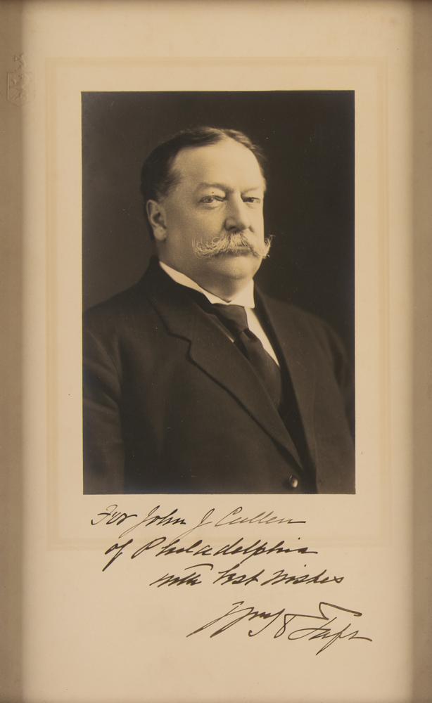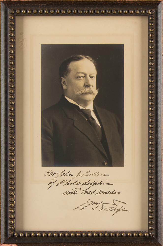 Distinguished vintage matte-finish 6.5 x 10.5 photo of Taft in a suit and tie, signed and inscribed in the lower border in ink, "For John J. Cullen of Philadelphia, with best wishes, Wm. H. Taft.” Framed to an overall size of 8 x 12. In fine condition.