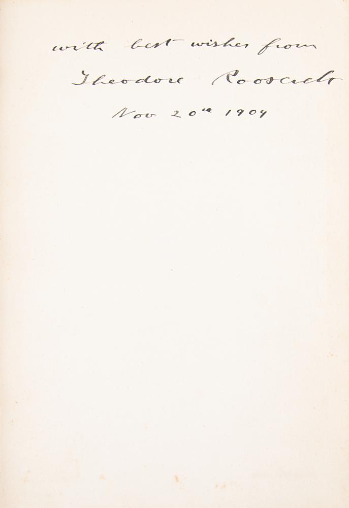 Signed book: The Works of Theodore Roosevelt, Vol. 13: Presidential Addresses and State Papers, Part One. Executive Edition. NY: P. F. Collier & Son. Hardcover, 5.75 x 8, 400 pages. Neatly signed on the first free end page in ink as president, "with best wishes from Theodore Roosevelt, Nov. 20th 1904." Autographic condition: fine. Book condition: VG-/None, with light wear at spine ends, cracked hinges and rear joint, and rubbing to boards.