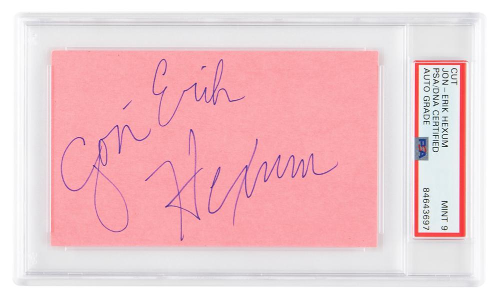Felt tip signature, "Jon-Erik Hexum,” on a pink 5 x 3 card. In very fine condition. Encapsulated in a PSA/DNA authentication holder, grading the autograph as "MINT 9." Given the actor's tragic death at the age of 26, Hexum's autograph remains quite scarce.