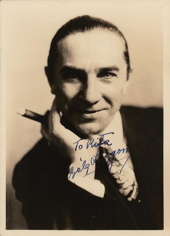 Choice vintage matte-finish 5 x 7 photo of Lugosi posing with a cigar in his hand, signed and inscribed in bold fountain pen, "To Rita, Bela Lugosi.” In very fine condition.