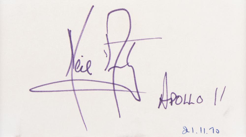 Bold vintage felt tip signature, "Neil Armstrong, Apollo 11,? on an off-white 4.75 x 2.75 card, handsomely double-matted with a portrait to an overall size of 10.75 x 16.5. A collector's date notation indicates that the signature was acquired on November 21, 1970. In fine condition, with a few small stains to the bottom edge.