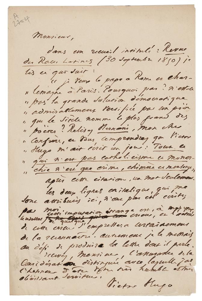 ALS in French, one page, 4.75 x 7.5, no date. Handwritten letter by the illustrious author, about religion and politics, and mentioning his most important play, 'Hernani.' In part (translated): "In a volume entitled Review of the Latin Races (30 September 1850), I read what the following: ‘I want the Pope in Rome and Charlemagne in Paris. And why not? Is it not the great democratic solution admirably put in verses by a poet which our century extols as the greatest among all poets? Read Hernani again, my dear colleague, and you will understand that Victor Hugo has once written to me: Everything which is not Catholicism and Monarchism is nothing but crime, daydreaming and fallacy.’ After this citation, only one word. These two lines, purported to be mine, have not been written by me. This bizarre attribution is, I think, the result of some mistake, and the author of this mistake will certainly very soon acknowledge it. Otherwise, I will challenge him to show the letter of which he writes about." In fine condition, with a few small tears and creases.