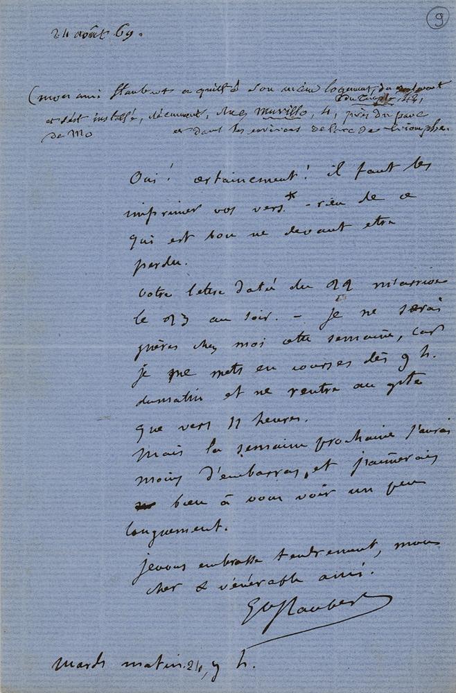 ALS signed “Gv. Flaubert,” one page, 5 x 8, August 24, 1869. Beautiful handwritten letter by the illustrious author to his "dear and venerable friend" Jean Clogenson, a month after the death of one of their common friends, Flaubert’s best friend and poet Louis Bouilhet. In part (translated): "Yes! Certainly! Your verses should be printed. Nothing good should be lost. I received in the evening of 23 your letter dated 22. I shall hardly be home this week, for I walk out at 9 a.m. and do not come back before around 11 p.m. But I shall have less trouble next week, and would like to spend quite a long time with you. I embrace you tenderly, my dear and venerable friend.” The verses he references are probably Bouilhet’s verses rather than Clogenson’s verses. The recipient has clipped and affixed the original address panel (also penned in Flaubert's hand) to the second integral sheet. In fine condition.