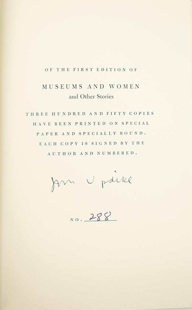 Signed book: Museums and Women. First edition, limited issue, numbered 288/350. NY: Alfred A. Knopf, 1972. Hardcover with dust jacket and slipcase, 5.75 x 8.25, 282 pages. Signed on the colophon in black ballpoint by John Updike. In fine condition, with light sunning to the dust jacket spine.