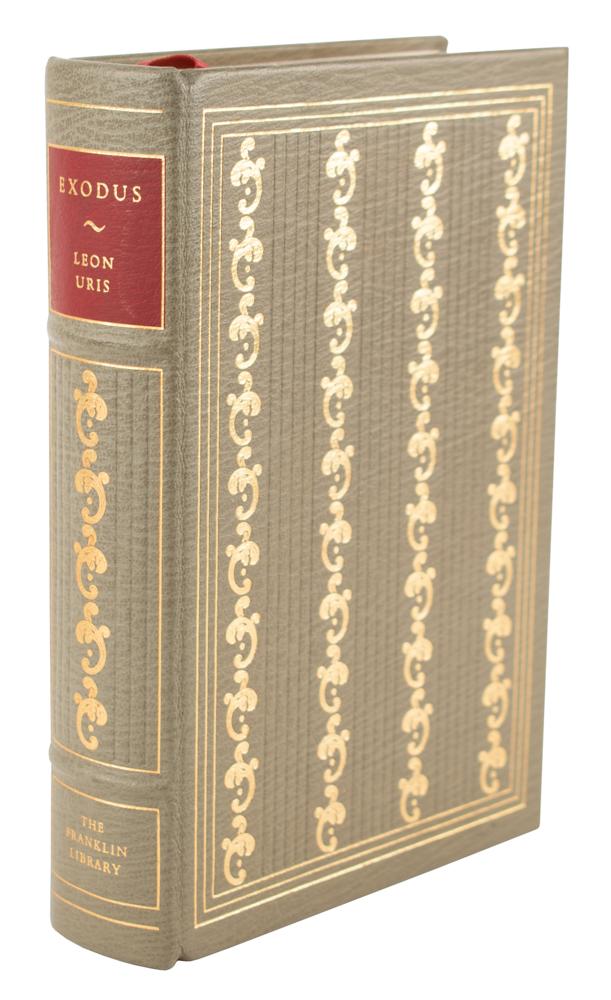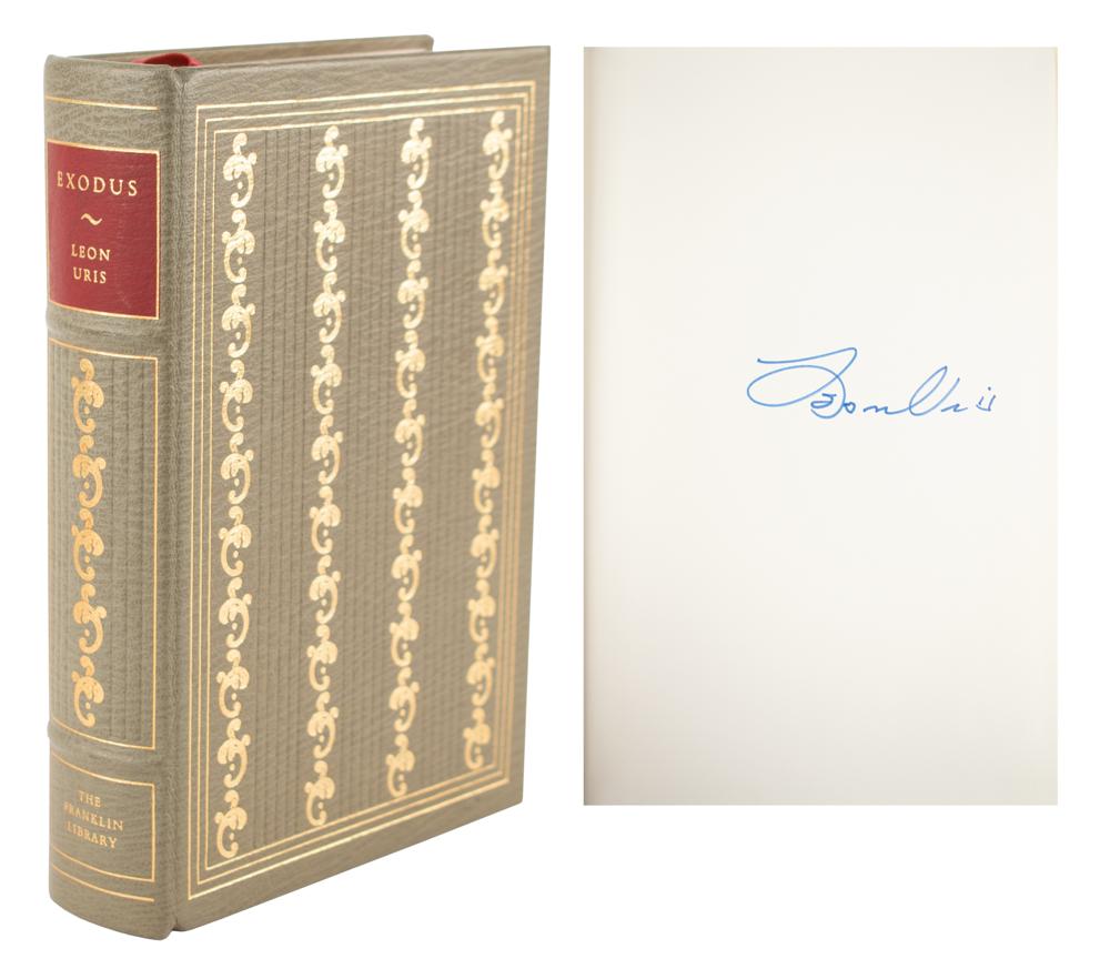 Signed book: Exodus. Franklin Center, PA: The Franklin Library, 1977. Leatherbound hardcover, 6.5 x 9.5, 718 pages. Signed on a free end page in blue felt tip by Leon Uris. In very fine condition.