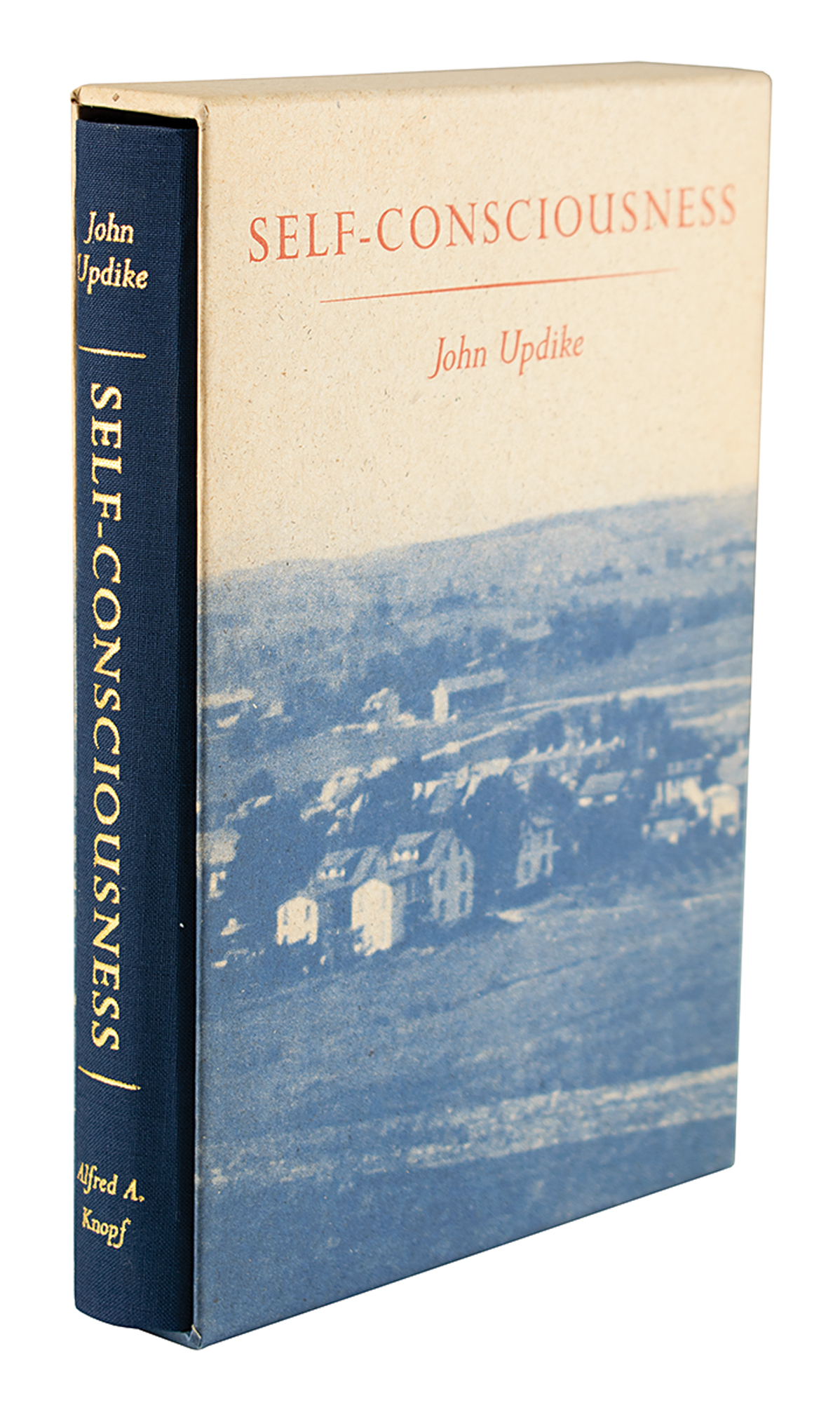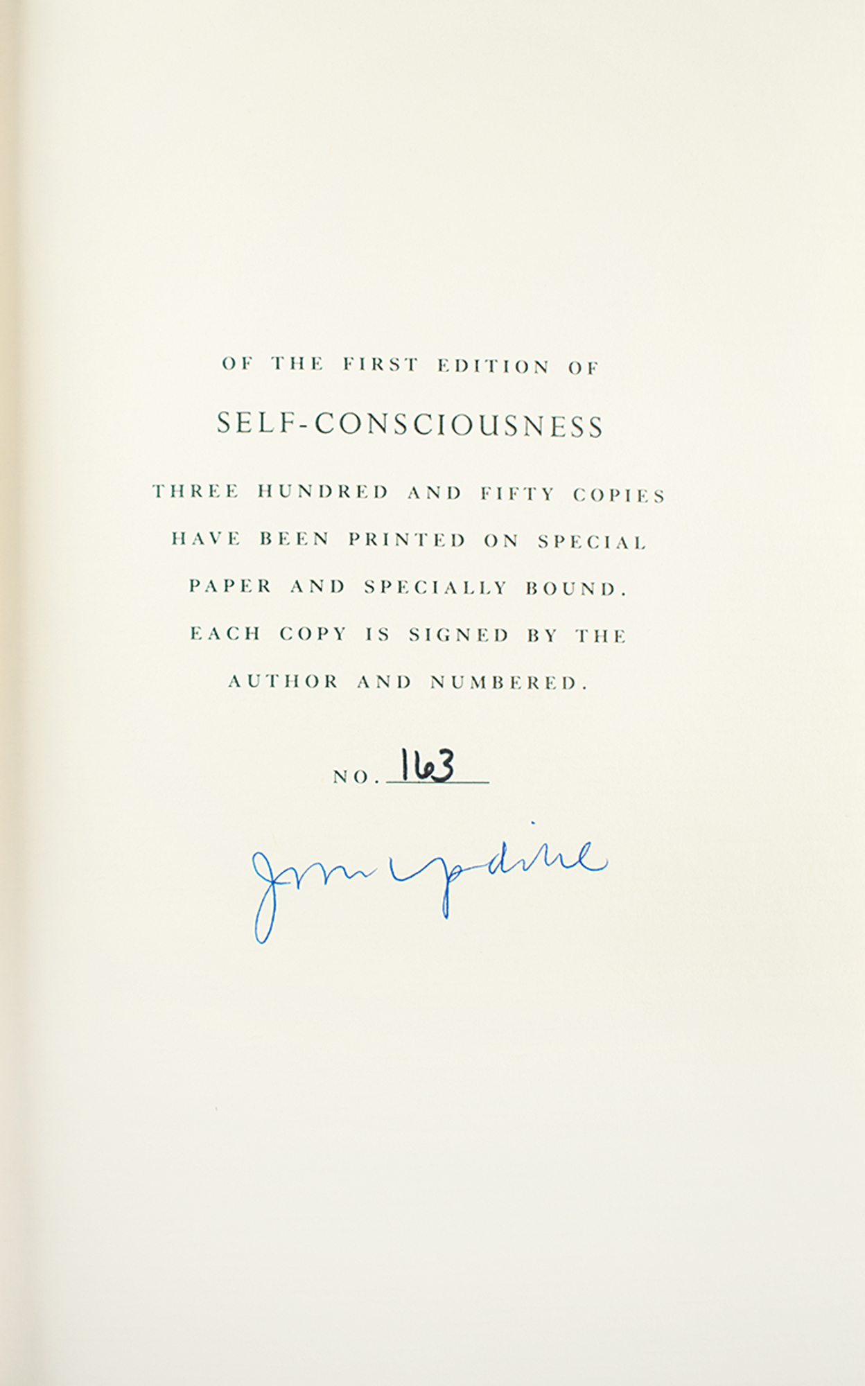 Signed book: Self-Consciousness: Memoirs. First edition, limited issue, numbered 163/350. NY: Alfred A. Knopf, 1989. Hardcover with dust jacket, 6 x 8.5, 257 pages. Signed on the colophon in blue ballpoint by John Updike. In very fine condition.