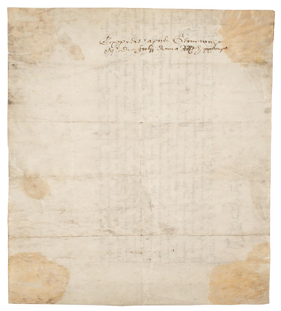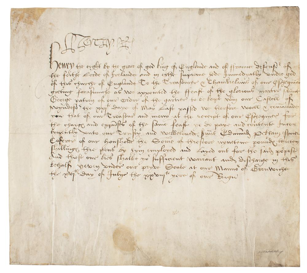 Vellum manuscript DS, signed “Henry R,” one page, 9 x 8, July 26, 1536. Document by which King Henry VIII orders the treasurer and chamberlain to pay Edmund Peckham, accountant of the Royal House, the sum of nineteen pounds and thirteen shillings to cover the expenses of the feast held on the occasion of the solemnity of St. George, patron saint of England. In fine condition, with scattered light soiling. St. George's Day was a major feast and national holiday in England on a par with Christmas from the early 15th century through the 17th century, but its popularity as a tradition waned by the end of the 18th century after the union of England and Scotland. King Henry VIII's autograph is rare and highly sought in any form, and this is an especially significant document as it pertains to St. George's Day.