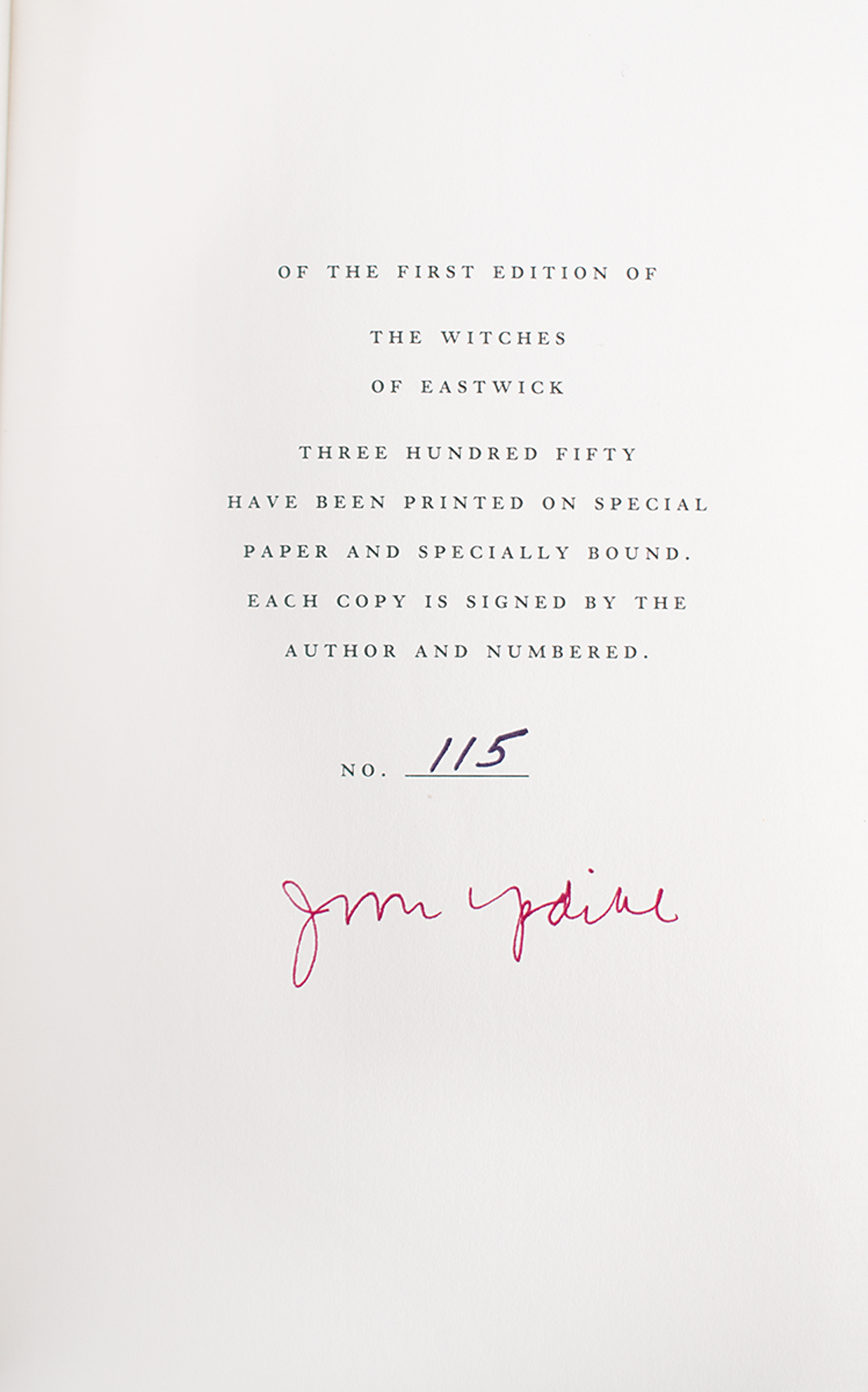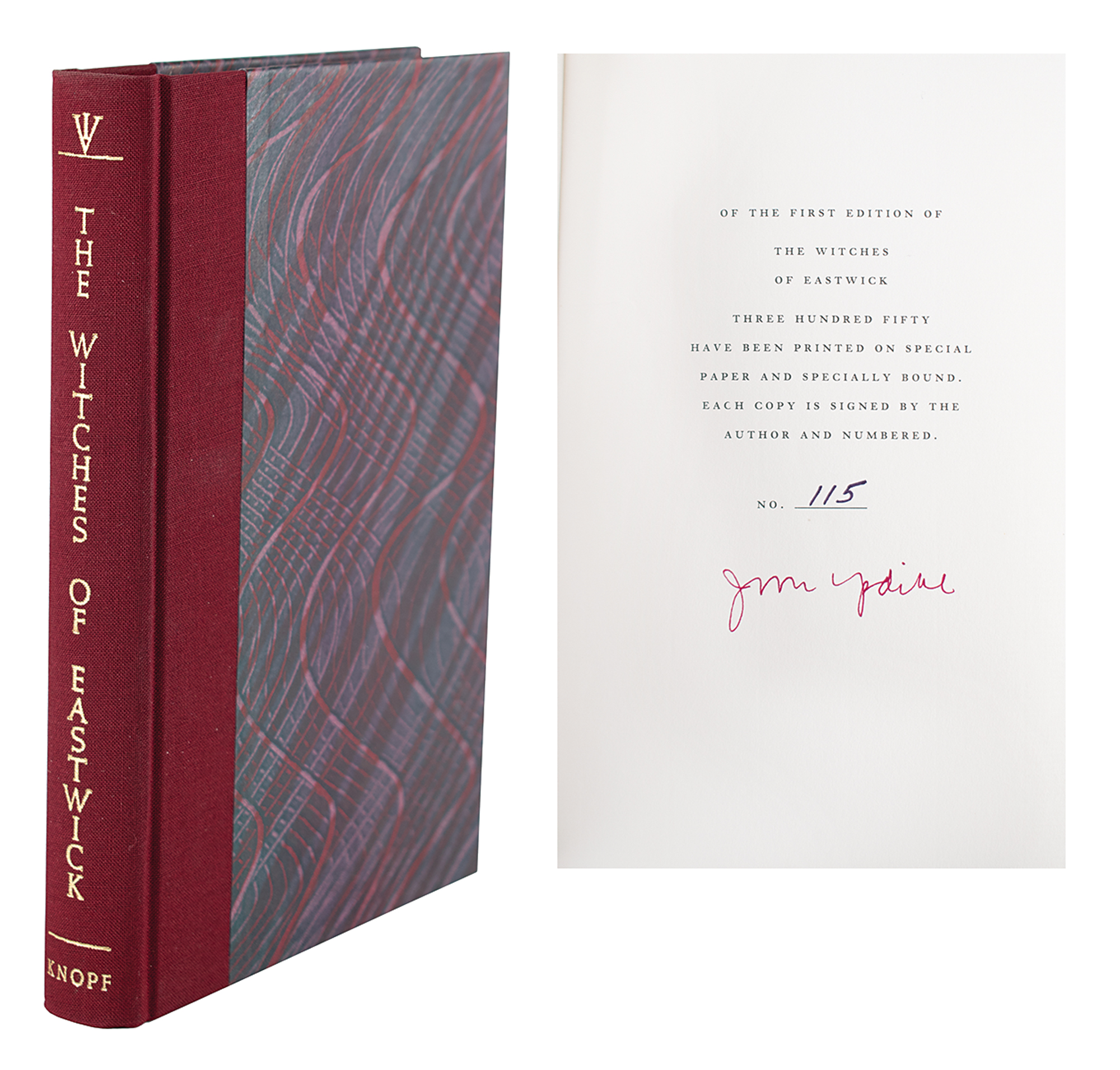 Signed book: The Witches of Eastwick. First edition, limited issue, numbered 115/350. NY: Alfred A. Knopf, 1984. Hardcover with slipcase, 5.75 x 8.5, 307 pages. Signed on the colophon in red ink by John Updike. In fine condition, with sunning to the slipcase.