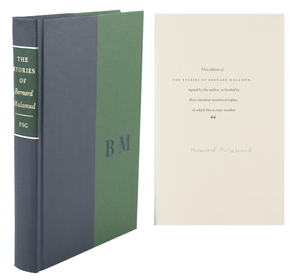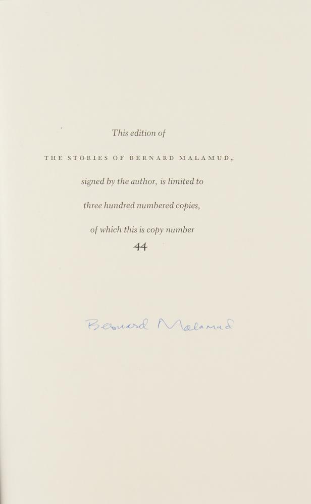 Signed book: The Stories of Bernard Malamud. First edition, limited issue, numbered 44/300. NY: Farrar, Straus and Giroux, 1983. Hardcover with slipcase, 6.25 x 9.25, 350 pages. Signed on the colophon in blue ballpoint by Bernard Malamud. In very fine condition.