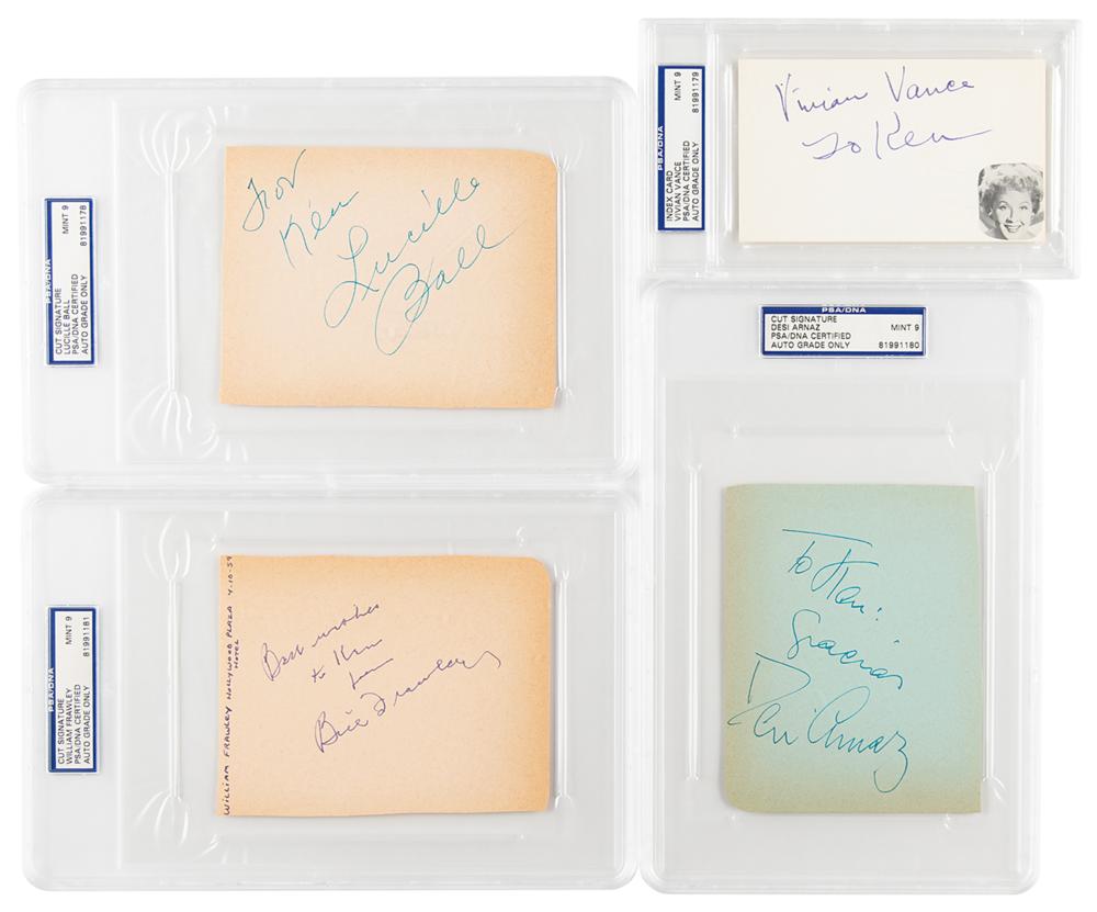 Fantastic group of four vintage ink signatures of the stars of I Love Lucy, all encapsulated and graded by PSA/DNA as "MINT 9." Penned on individual cards and album pages, ranging in size from 5 x 3 to 5.5 x 4.25, all are inscribed to "Ken." Includes: Lucille Ball, Desi Arnaz, Bill Frawley, and Vivian Vance. In overall fine condition.