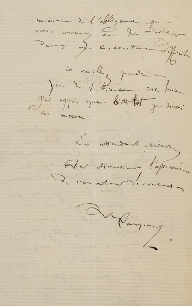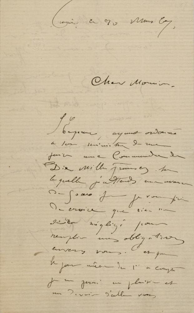 French sculptor and painter (1827-1875) from whom Napoleon III commissioned many works. Untranslated ALS in French, one page both sides, 4.75 x 7.5, March 30, 1867. In fine condition.