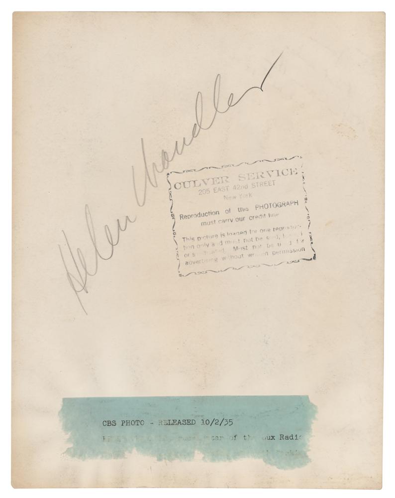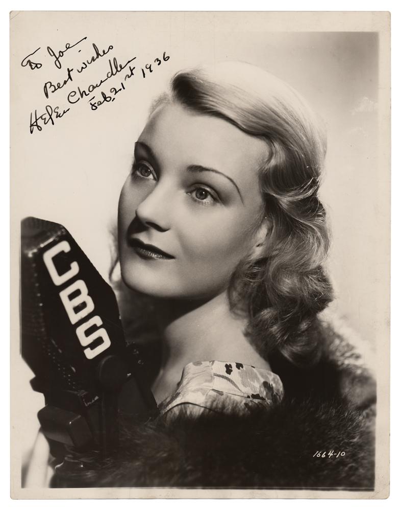 Actress (1906-1965) best remembered as Mina in the film Dracula with Bela Lugosi. Vintage glossy 8 x 10.25 publicity photo of Chandler posing next to a CBS microphone, signed and inscribed in fountain pen, "To Joe, Best wishes, Helen Chandler, Deb. 21st 1936.” Reverse bears a Culver Service stamp and remnants of a CBS Photo label dated to October 2, 1935. In fine condition, with light rippling along the bottom edge.