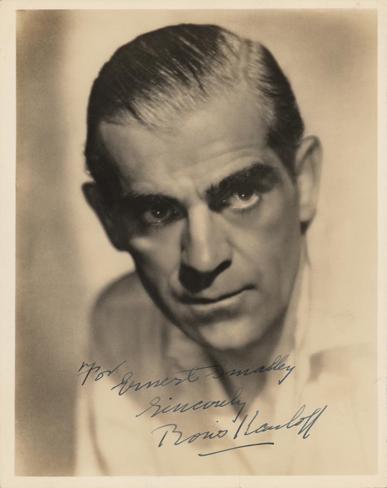 Vintage matte-finish 8 x 10 head-and-shoulders photo of the highly regarded actor, signed and inscribed in fountain pen, "For Ernest Smalley, Sincerely, Boris Karloff.” Reverse bears a Roger Hurlburt collection stamp. In very fine condition.