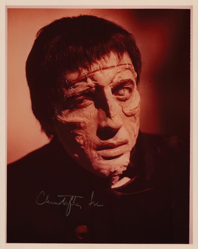 Color glossy 8 x 10 close-up photo of Christopher Lee wearing his gruesome makeup effects as the Creature from the classic 1957 horror film The Curse of Frankenstein, signed in silver ink. In fine condition.
