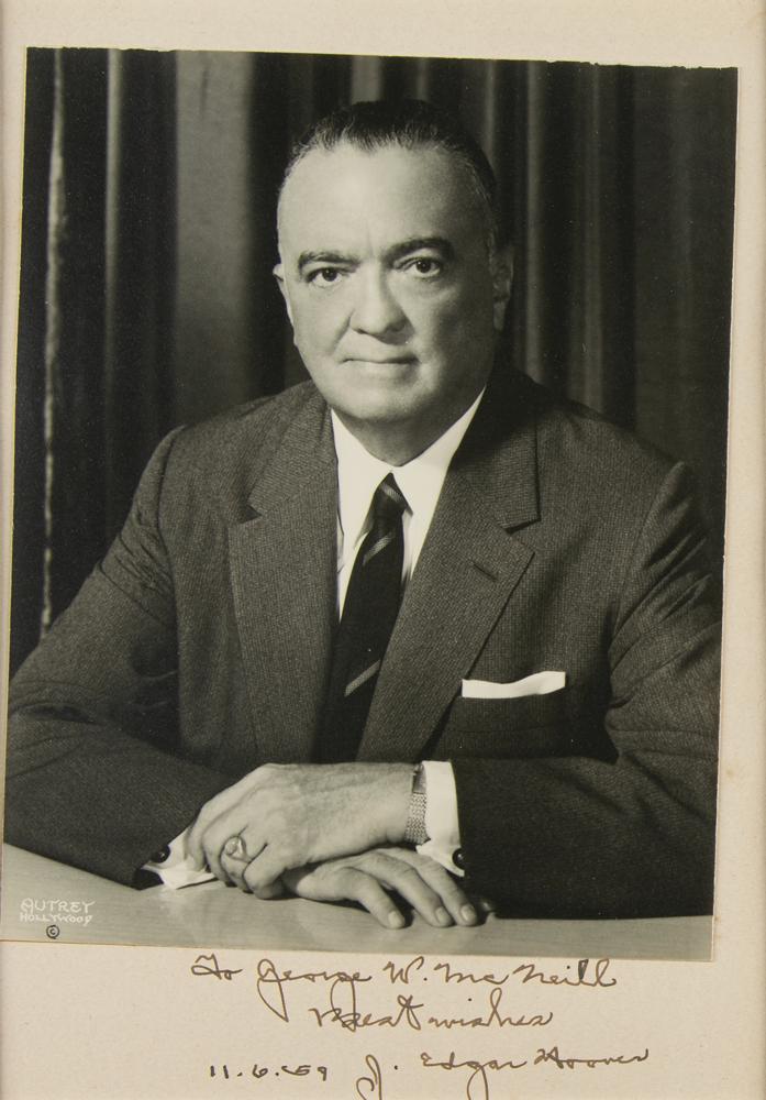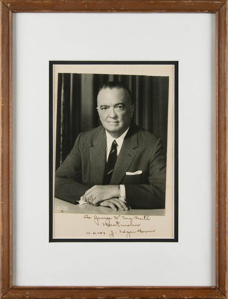 Vintage matte-finish 6.5 x 8 photo of Hoover by Autrey of Hollywood, affixed to a 7 x 10 mount, signed and inscribed on the mount in fountain pen, "To George W. McNeill, Best wishes, J. Edgar Hoover, 11.6.59.” Double-matted and framed to an overall size of 13 x 17. In fine condition.