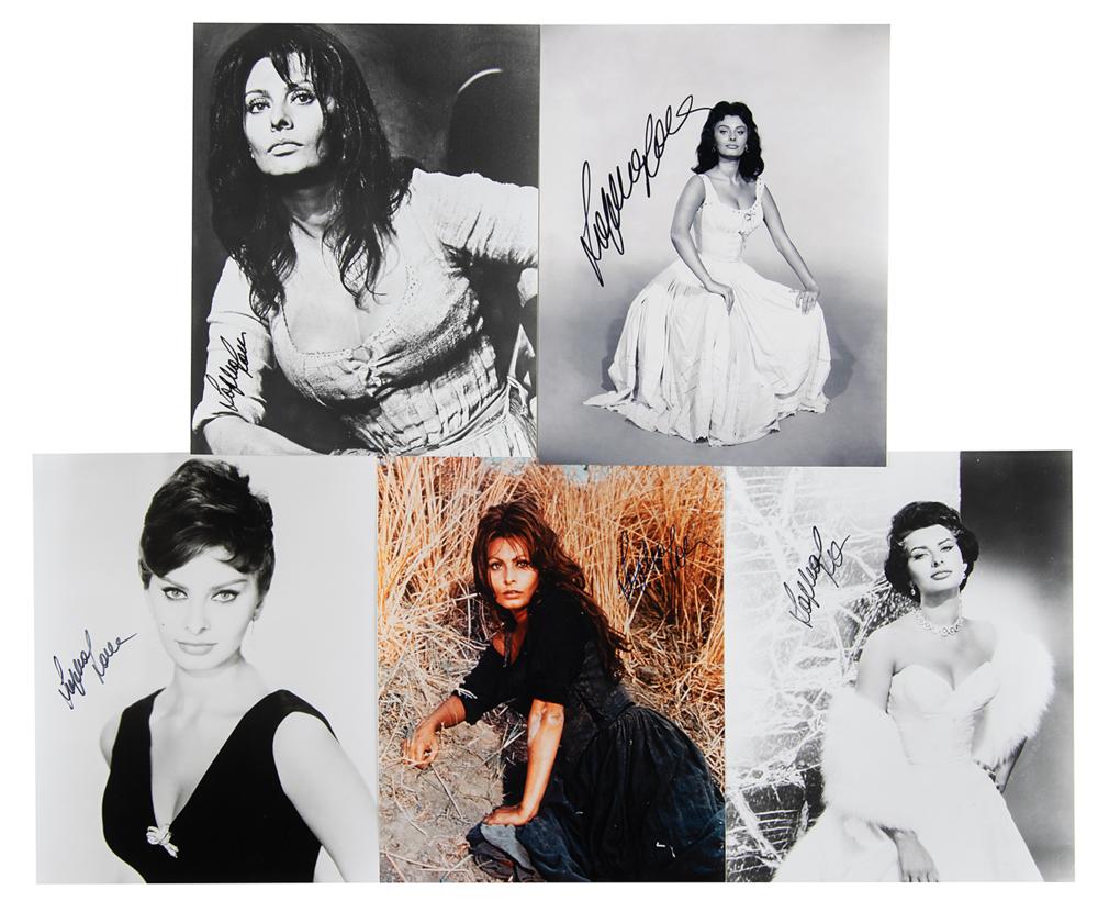 Five different glossy 8 x 10 photos of Sophia Loren from throughout her career, each signed in black felt tip by the beautiful Italian actress. In overall fine condition.
