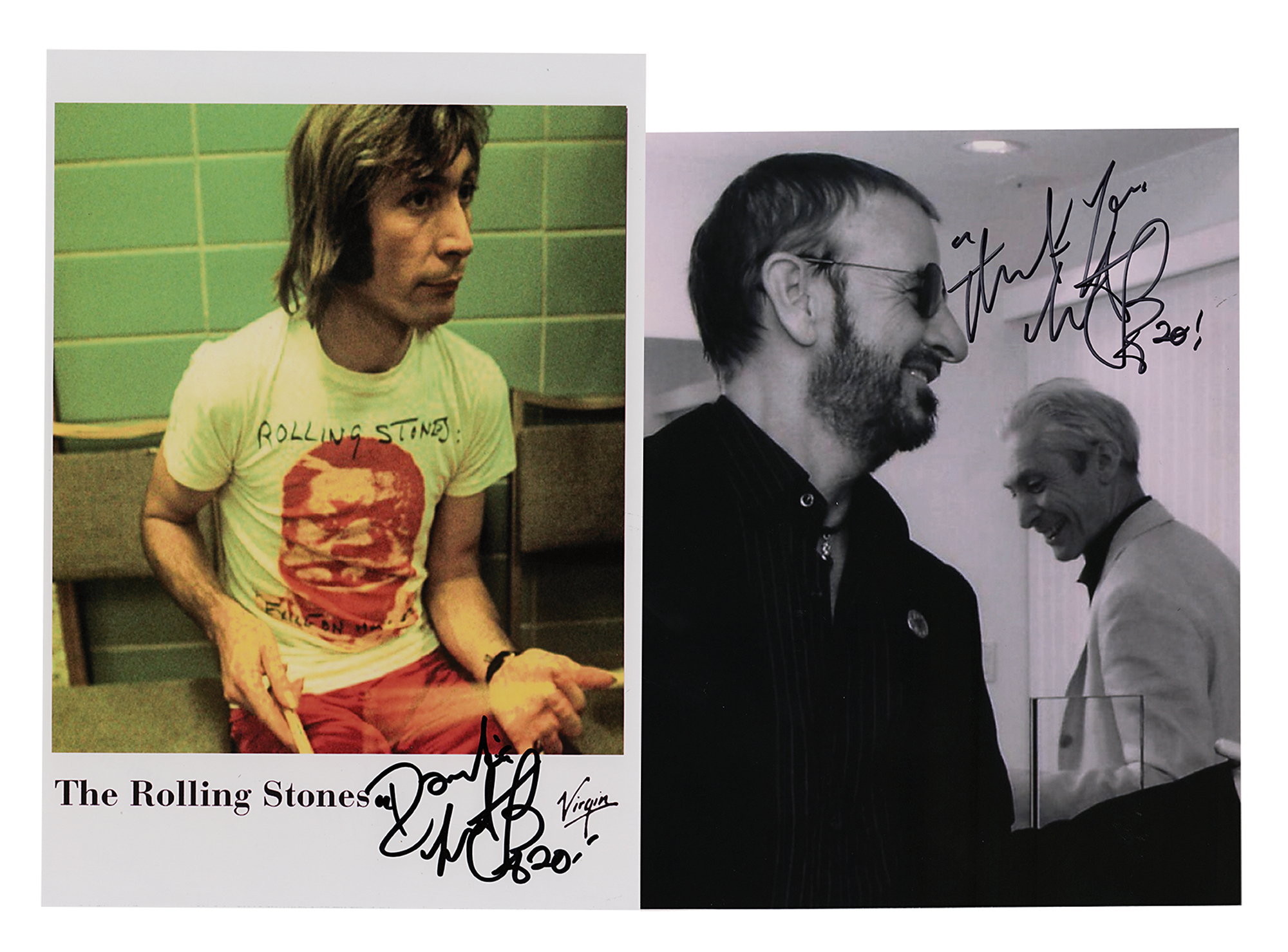 Two glossy photos signed in black felt tip by late Rolling Stones drummer Charlie Watts: one 8 x 10.25 example shows Watts with Beatles drummer Ringo Starr, with Watts adding “Thank you” and “20!,” and the other color 8 x 11.25 photo depicts Watts backstage with his drumsticks, with Watts adding” Danke” and “20.” In overall fine condition.