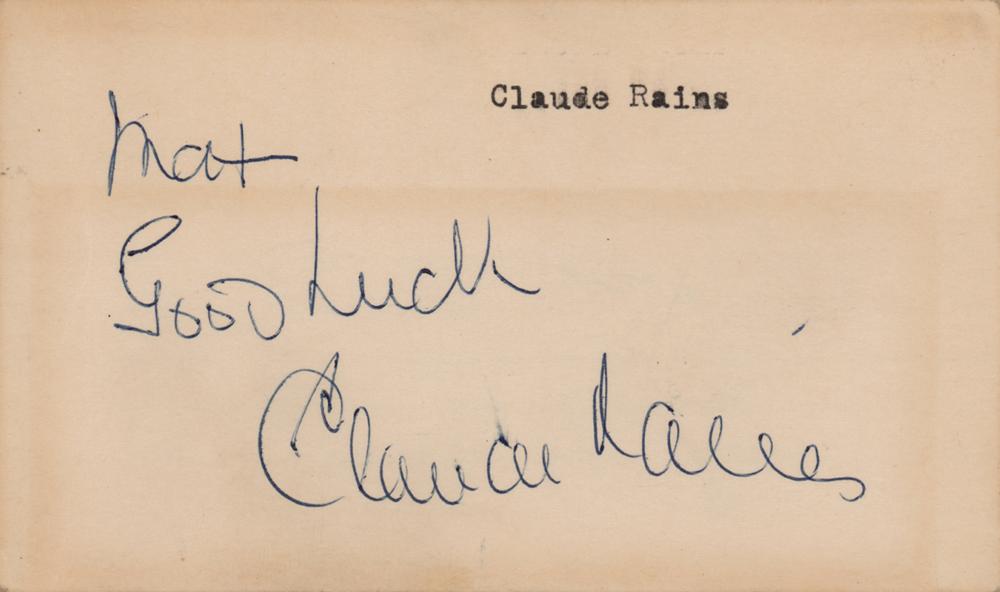Vintage ballpoint signature and inscription, "Mat, Good luck, Claude Rains,” on an off-white 5 x 3 card. In fine condition, with light toning from prior display.