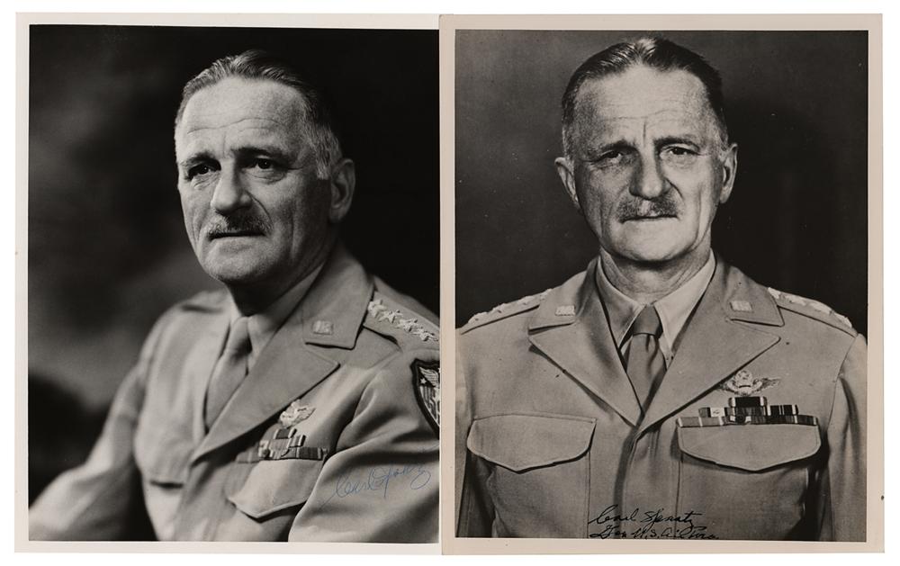 Two vintage glossy 8 x 10 photos of General Spaatz in his four-star military uniform, one signed in blue ballpoint, “Carl Spaatz,” and the other signed in fountain pen, “Carl Spaatz, Gen. U.S. Air Force.” In overall very good to fine condition, with some noticeable creasing to both.