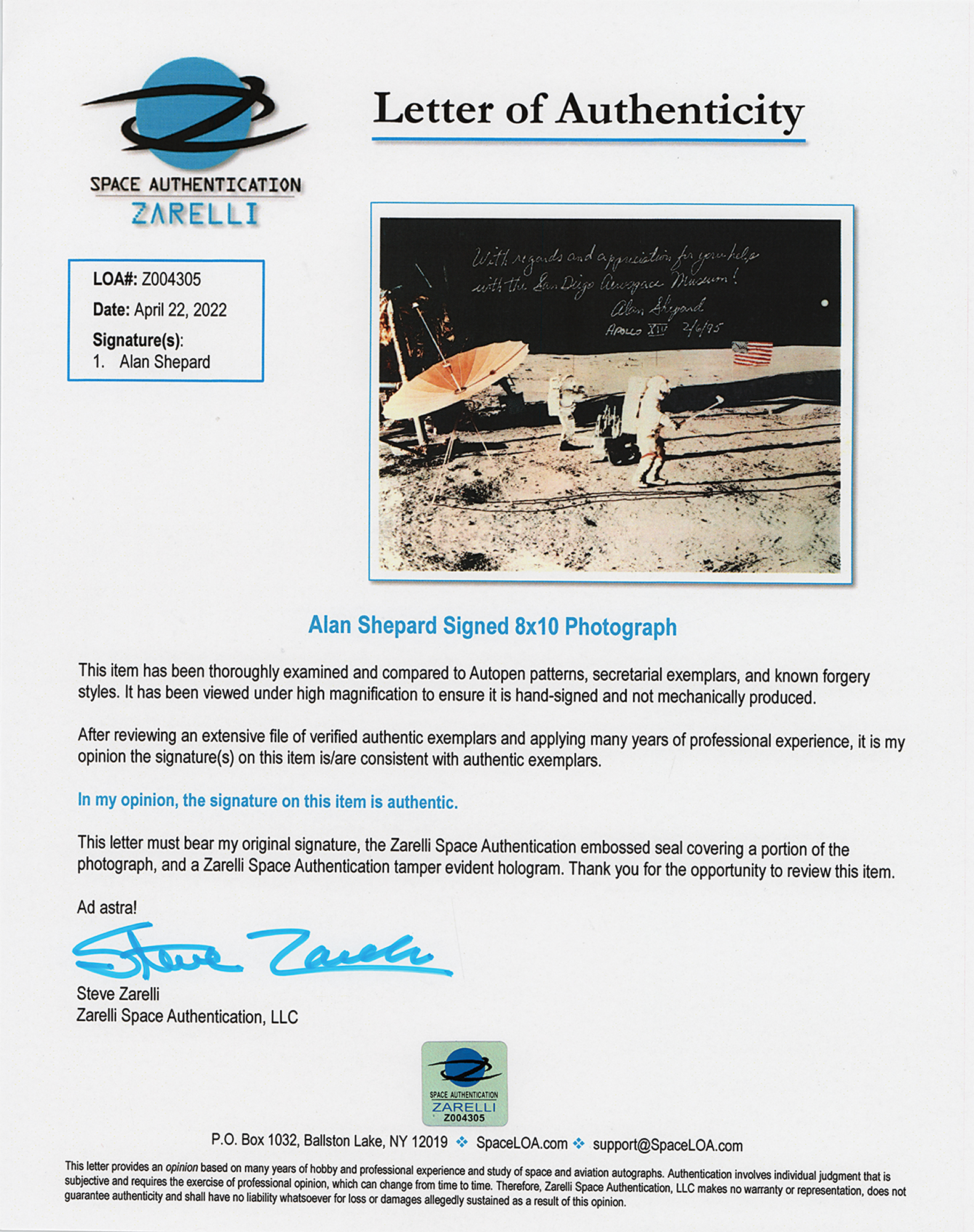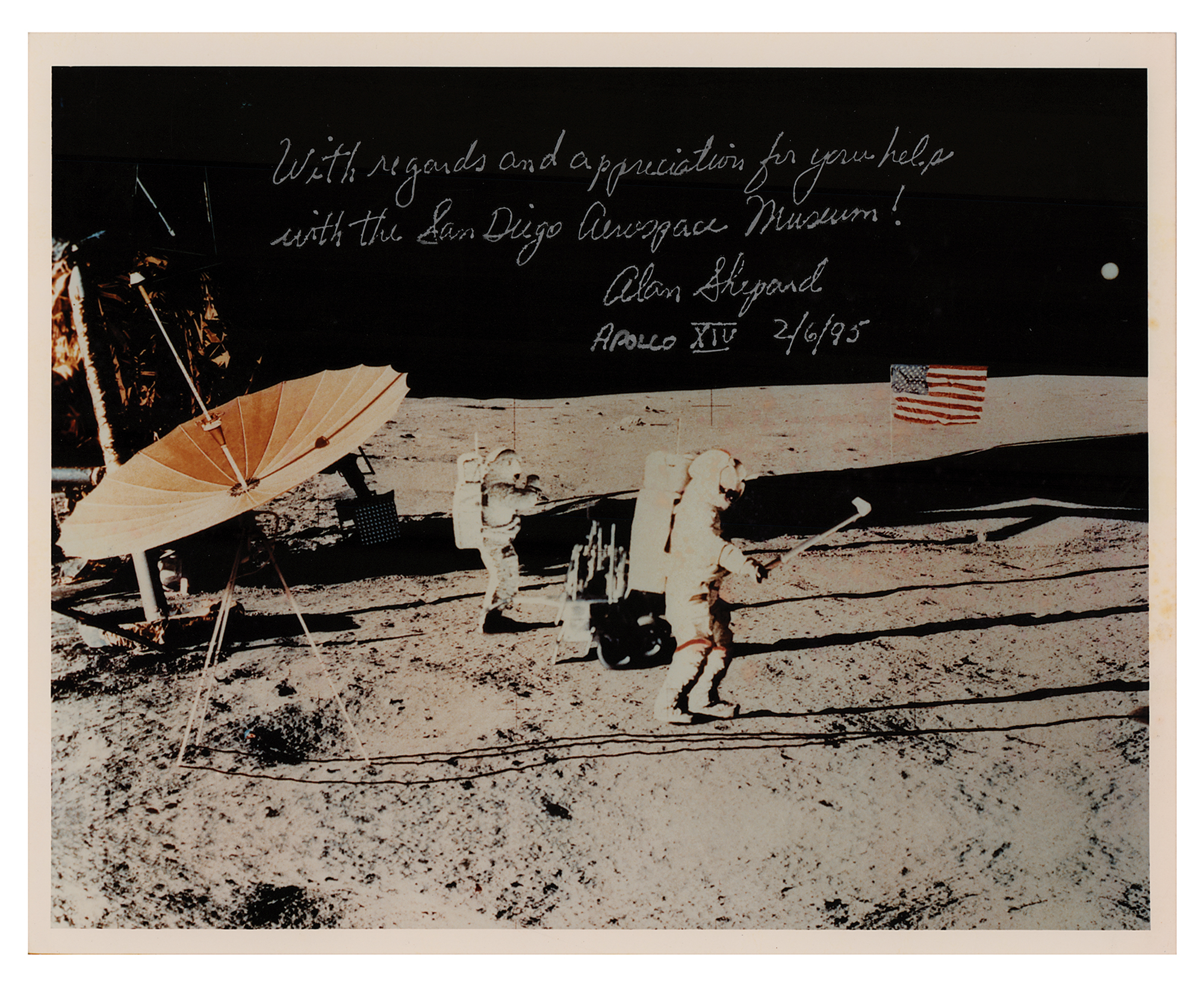 Iconic color glossy 10 x 8 photo of Apollo 14 CDR Alan Shepard playing golf on the moon, signed and inscribed in silver ink, "With regards and appreciation for your help with the San Diego Aerospace Museum! Alan Shepard, Apollo XIV, 2/6/95.” In fine condition, with a light crease to the lower right edge. Accompanied by a full letter of authenticity from Zarelli Space Authentication.