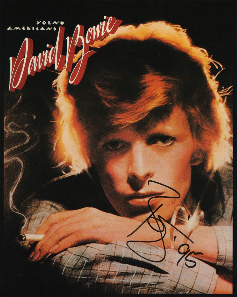 Color 8.75 x 10.75 book photo of the Young Americans album cover, signed in black felt tip, "Bowie '95." In fine condition. Accompanied by a letter of authenticity from Bowie expert Andy Peters. A classic Bowie image boasting a larger, bold autograph.