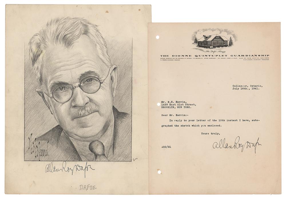 Canadian obstetrician (1883-1943) remembered for delivering and caring for the Dionne quintuplets, the first quintuplets known to survive early infancy. Two items: an original pencil sketch of the famous doctor by M. H. Herrin, accomplished on an off-white 9.25 x 12 sheet, signed in the lower border in fountain pen, "Allan Roy Dafoe"; and a TLS, one page, 8.25 x 11, The Dionne Quintuplet Guardianship letterhead, July 16, 1941, returning the sketch to the artist: "In reply to your letter of the 15th instant I have, autographed the sketch which you enclosed." In overall fine condition, with three file holes to the transmittal letter.