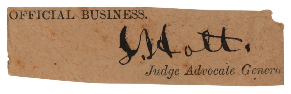 Politician (1807-1894) who was a member of the Buchanan administration, later serving as Judge Advocate General of the Army. Most notably, he was the chief prosecutor in the trial of those accused of involvement in the conspiracy to assassinate President Lincoln. Bold ink signature, "J. Holt,” on a beige 3.25 x 1 slip. In fine condition, with some light creasing.