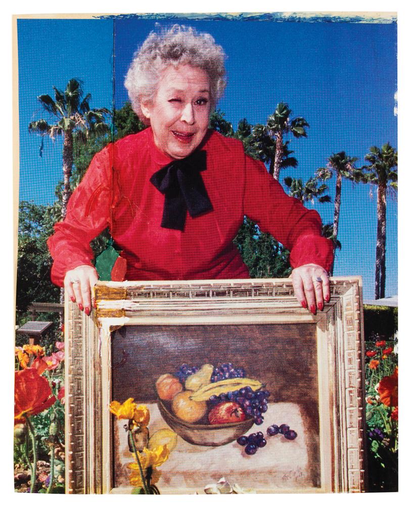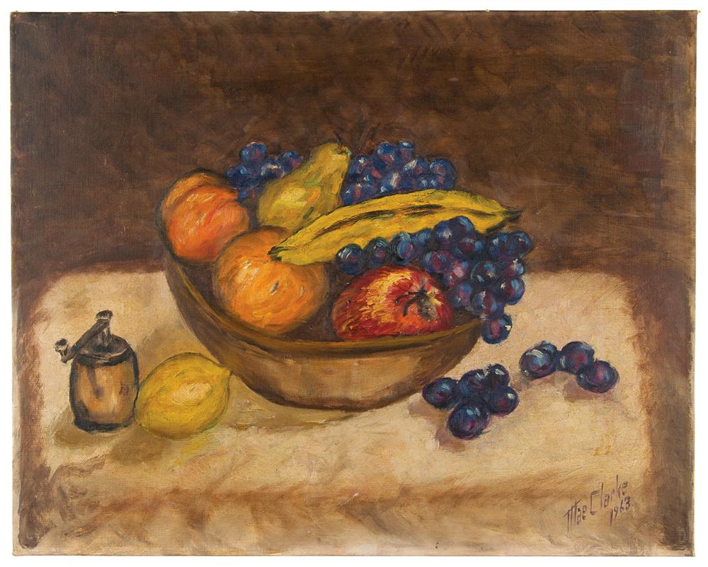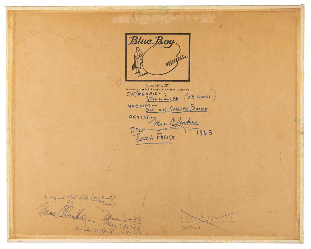 Classic actress (1910-1992) remembered for her roles in Frankenstein and The Public Enemy. Scarce original still life painting by actress Mae Clarke, accomplished in oil on a 20 x 16 canvas panel, signed in the lower right corner in paint, "Mae Clarke, 1963." The painting is a classic still life study, portraying several fruits—lemons, grapes, apples, oranges, and a banana—in a tabletop bowl. Clarke writes out the painting's info on the reverse, including the title, "Seven Fruits," and date of completion, "April 1st 1963." In fine condition. Accompanied by a magazine photo of Clarke posing with the painting in her garden.