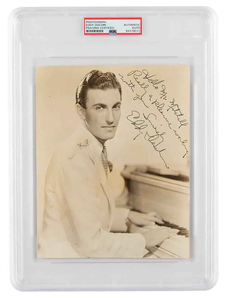 Vintage glossy 7 x 9 photo of Duchin at his piano, signed and inscribed in fountain pen, "Hello Mr. Mitchell, Really a pleasure working with you, sincerely, Eddy Duchin.” In fine condition, with trimmed edges, and small stains to his lapel. Encapsulated in a PSA/DNA authentication holder.