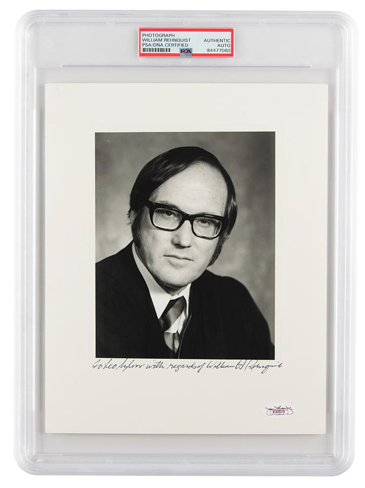 Matte-finish 8 x 10 head-and-shoulders of Associate Justice Rehnquist, signed and inscribed in the lower border in black ballpoint, "To Leo Sylver, with regards of William H. Rehnquist.” In very fine condition, with a JSA label affixed to the lower right (certificate not present). Encapsulated in a PSA/DNA authentication holder.