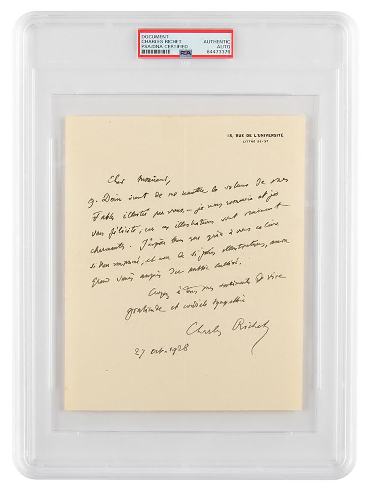 French physiologist (1850-1935) who won the 1913 Nobel Prize in Medicine for his work in anaphylaxis, which led to advances in the treatment of allergies. ALS in French, one page, 6.75 x 8.25, 15 rue de l'Universite letterhead, October 27, 1928. Untranslated handwritten letter by the noted scientist. In fine condition. Encapsulated in a PSA/DNA authentication holder.