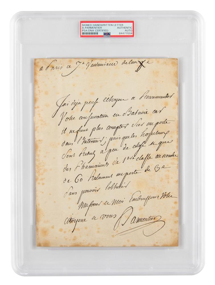 Important contributor to food and nutrition (1737-1813), who was a promoter of the potato as a food source and established the first mandatory smallpox vaccination. ALS in French, signed “Parmentier,” one page, 7 x 9.25, September 29, 1801. Untranslated handwritten letter to a pharmacist in Breda. In very good to fine condition, with moderately heavy overall foxing. Encapsulated in a PSA/DNA authentication holder.