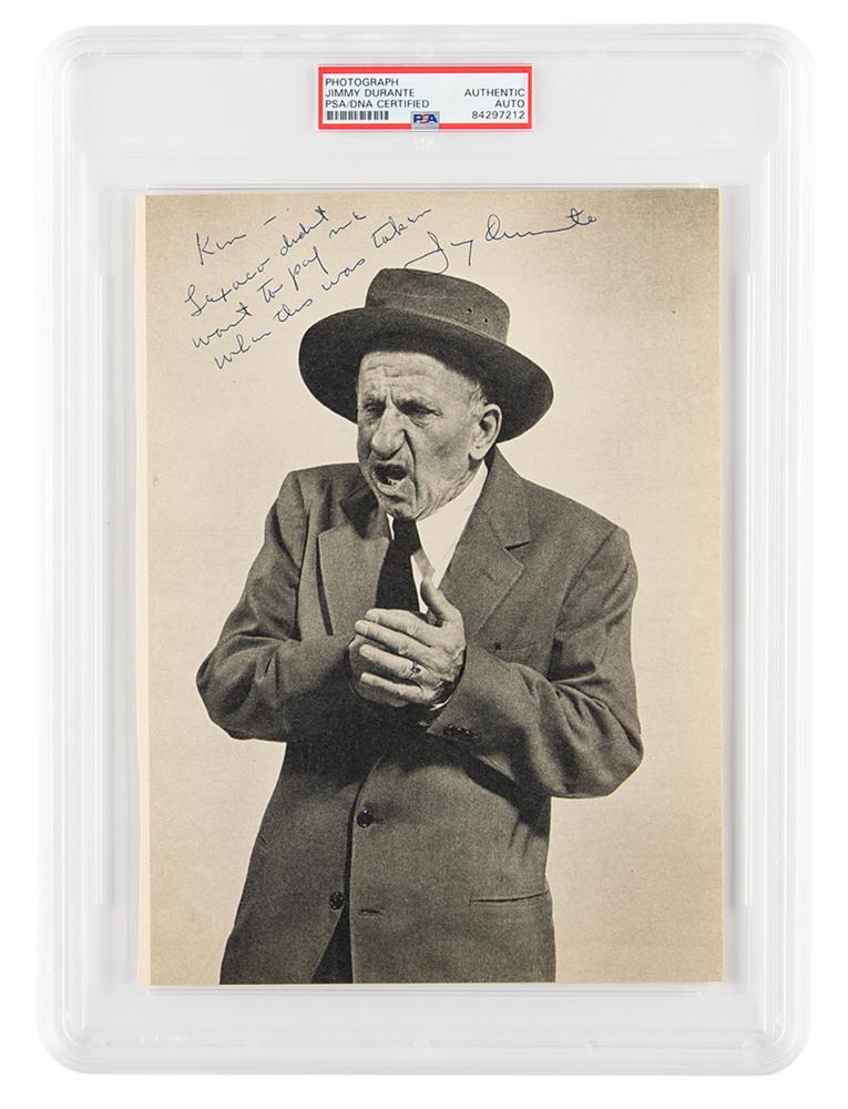 Vintage 7.5 x 10 paperstock photo of Durante caught mid-sentence in a humorous half-length pose, signed and inscribed in ballpoint, "Ken—Texaco didn't want to pay me when this was taken, Jimmy Durante.” In fine condition. Encapsulated in a PSA/DNA authentication holder.