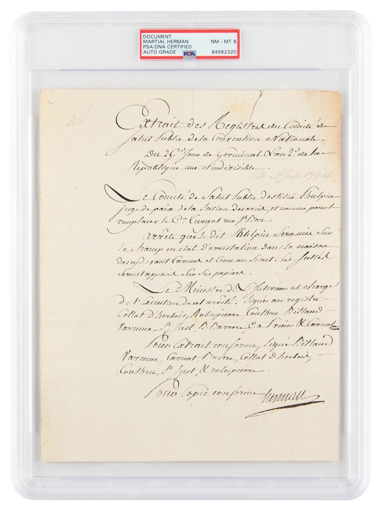 Lawyer and a chief judge (1759-1795) during the Reign of Terror. His most famous cases were against Marie Antoinette and Georges Danton. As the commissioner of police, he dealt with the Luxembourg prison conspiracies, shortly before the Jacobin regime fell. Manuscript DS in French, signed “Herman,” one page, 8 x 10, April 14, 1794. Untranslated document related to the public status committee of the national convention. Signed crisply at the conclusion by Martial Herman. In fine condition. Encapsulated and graded by PSA/DNA as "NM-MT 8."