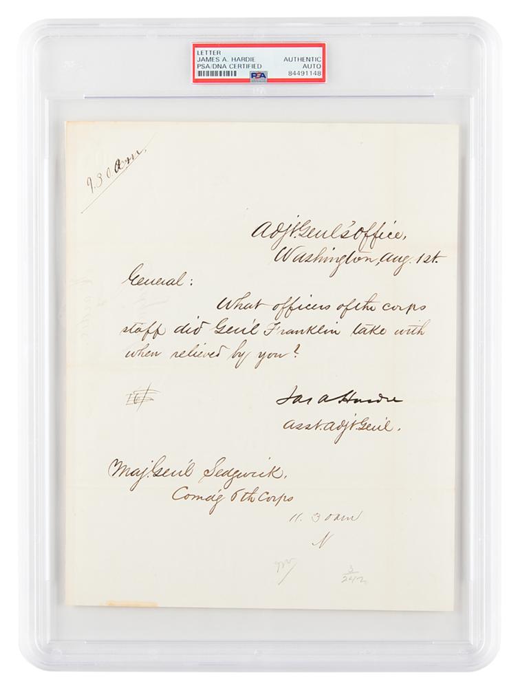 Union officer (1823-1876) who served in a number of important administrative positions during the Civil War. Civil War-dated LS signed “Jas. A. Hardie,” one page, 8 x 9.75, August 1 [1862 or 1863]. Addressed from the Adjutant General's Office in Washington, a letter to Major General John Sedgwick, in full: "What officers of the corps staff did Gen'l Franklin take with him when relieved of you?" In fine condition. Encapsulated in a PSA/DNA authentication holder.