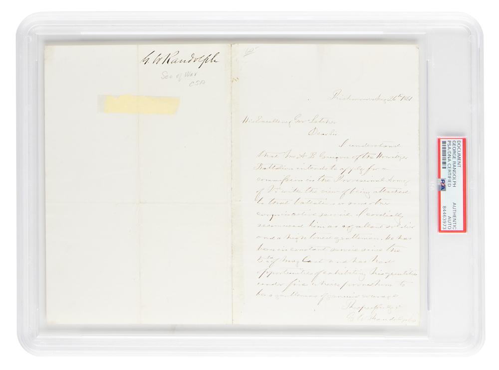 Confederate general, lawyer, and planter (1818-1867) who served in 1862 as the Confederate States secretary of war during the Civil War, when he reformed procurement, wrote the conscription law, and strengthened western defenses; the youngest grandson of President Thomas Jefferson. Civil War-dated ALS signed “G. W. Randolph,” one page, 5.25 x 8, August 26, 1861. Handwritten letter to Virginia Governor John Letcher, in part: “I understand that?A. B. Guigon of the Howitzer Battalion intends to apply for a commission of the Provisional Army of V’a with the view of being attached to that battalion or some other comparative service. I cordially recommend him as a gallant soldier and high toned gentleman.” Alexander B. Guigon (1831-1878) would go on to become a Captain of Virginia Artillery. In fine condition, with light toning along the left edge. Encapsulated in a PSA/DNA authentication holder.