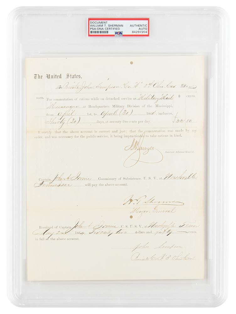 Civil War-dated partly-printed DS, signed “W. T. Sherman,” one page, 7.75 x 9.75, May 2, 1864. Subsistence document issued to Private John Simpson for "commutation of rations while on detached service as Military Mail Messenger at Headquarters Military Division of the Mississippi?at seventy-five cents per day." Signed below by William T. Sherman, with another hand adding "Major General," and countersigned by R. M. Sawyer, Assistant Adjutant General of forces in Nashville. In fine condition, with several small punch holes, one of which touches Sherman's first initial. Encapsulated in a PSA/DNA authentication holder.