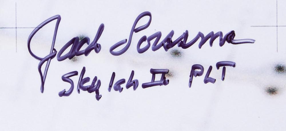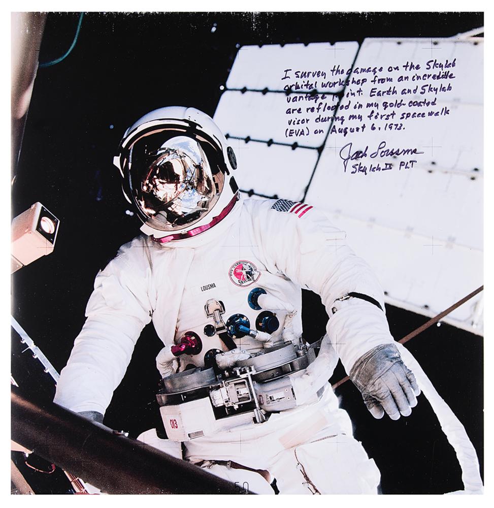 Uncommonly large color glossy 23 x 23 photo of Pilot Jack Lousma performing an EVA during the Skylab 3 mission, signed in black felt tip, “I survey the damage on the Skylab orbital workshop from an incredible vantage point. Earth and Skylab are reflected in my gold-coated visor during my first spacewalk (EVA) on August 6, 1973. Jack Lousma, Skylab II PLT.” In fine condition, with apparent scuffs and wear inherent to the original image and not the photo.