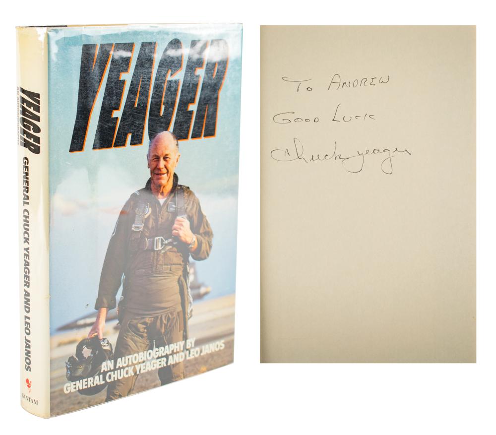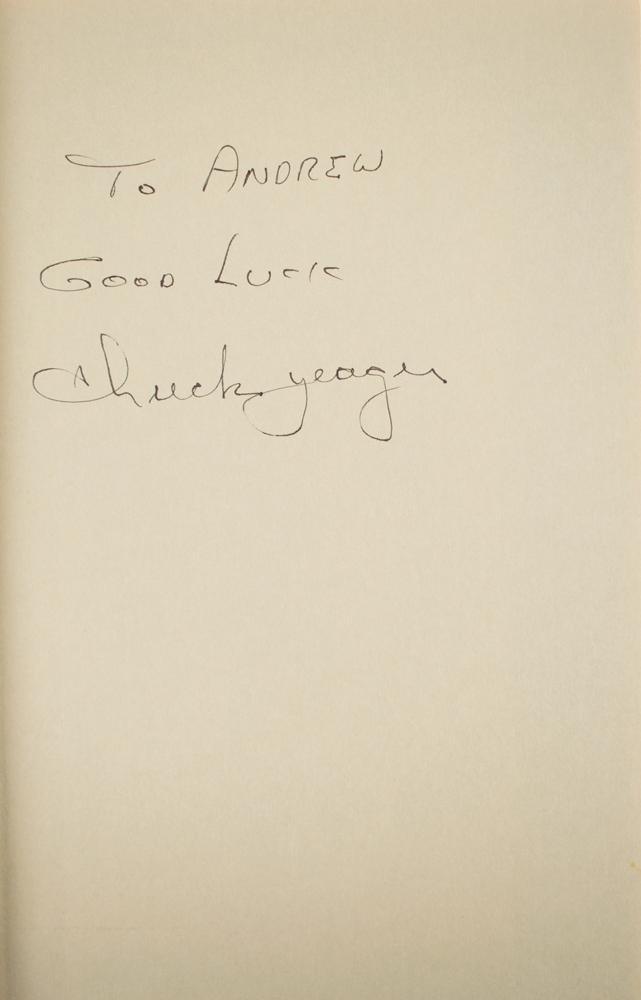 Signed book: Yeager. Later printing. Toronto: Bantam Books, 1985. Hardcover with dust jacket, 6.25 x 9.25, 342 pages. Signed and inscribed on the first free end page in black ink, "To Andrew, Good luck, Chuck Yeager." In fine condition.