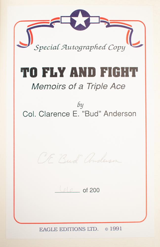 Two books: a first edition of To Fly and Fight: Memoirs of a Triple Ace, hardcover with dust jacket, published by St. Martin’s Press in 1990, signed in pencil by C. E. ‘Bud’ Anderson on a limited edition bookplate affixed to the first free end page, which is numbered 66/200; and a first edition of Dick Bong: Ace of Aces, hardcover with dust jacket, published by Duell, Sloan and Pearce in 1960, signed on the half-title page in blue ballpoint by General George C. Kenney and inscribed by Vic Crowell. In overall fine condition.