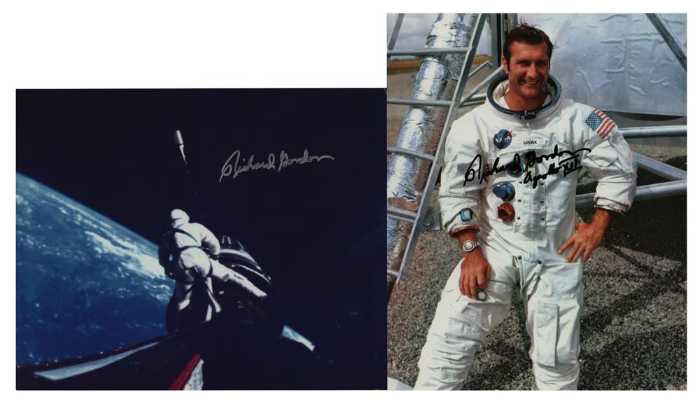 Two color glossy photos, 8 x 10 and 10 x 8, one of Gordon posing in his white space suit, signed in black felt tip, “Richard Gordon, Apollo XII,” and the other of Gordon performing an EVA during the Gemini 11 mission, signed in silver ink, “Richard Gordon.” In overall fine condition, with small edges creases, and an edge tear to the portrait.