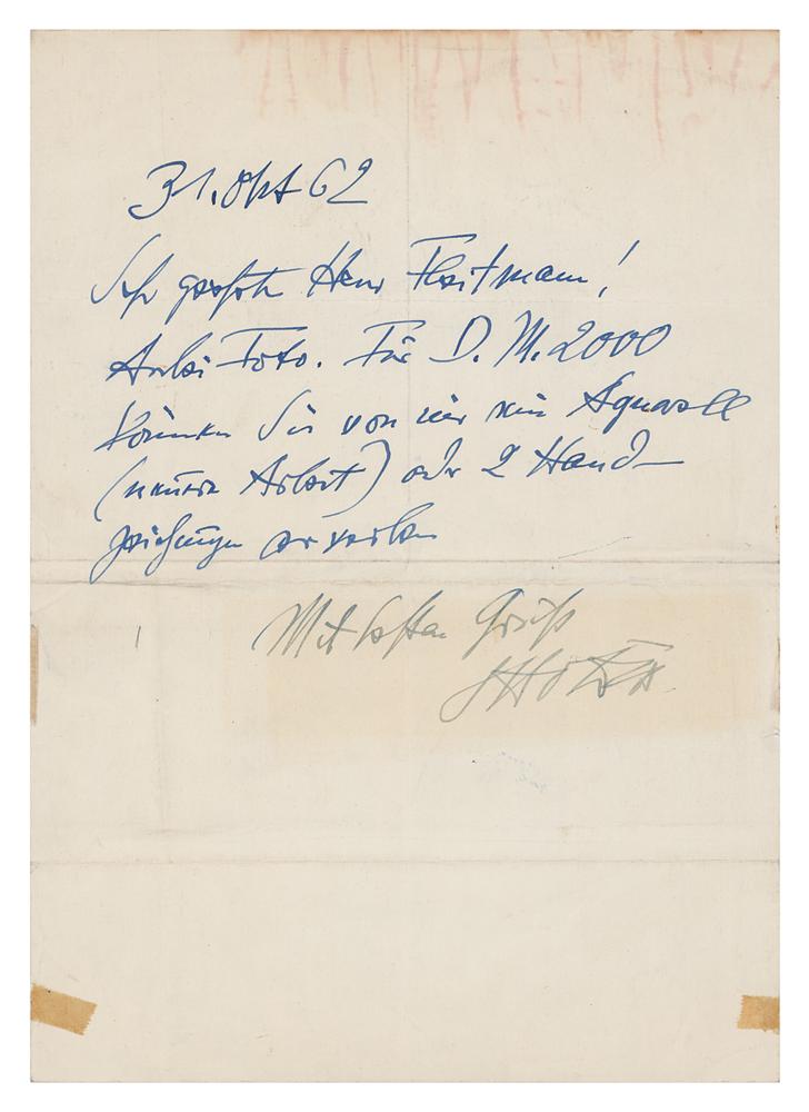 German artist (1891-1969) best known for his Expressionist depictions of Weimar society and the brutality of war. ALS in German, one page, 8.25 x 11.75, October 31, 1962. A handwritten letter to a customer, in part (translated): "Enclosed is a photo. For 2,000 DM you can acquire from me a watercolor (one of my more recent works) or two hand-drawn drawings.” In very good to fine condition, with light stains to the top edge, and toning in the signature area from prior display.