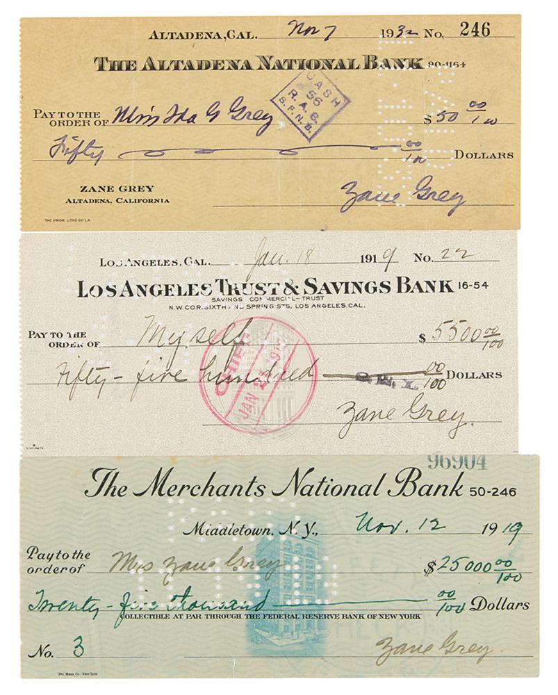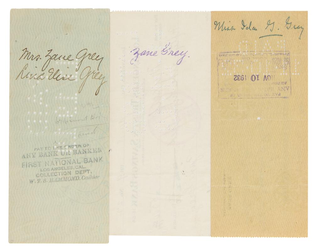 Three bank checks filled out and signed by author Zane Grey, each 6.25 x 2.75, dated to 1919 and 1932. Grey cuts checks to his wife, “Mrs. Zane Grey,” for $25,000, to his sister, “Miss Ida G. Grey” for $50, and to “Myself” for $5500, with Grey adding his endorsement signature on the reverse. In overall fine condition. Accompanied by two more checks filled out and signed by Grey’s wife, Lina Elise Grey (Dolly), who sends $3000 to their son Loren in 1951, and $22,320 to the IRS in 1932. An amusing Grey family check lot with a total of five autographs from the great Western novelist.