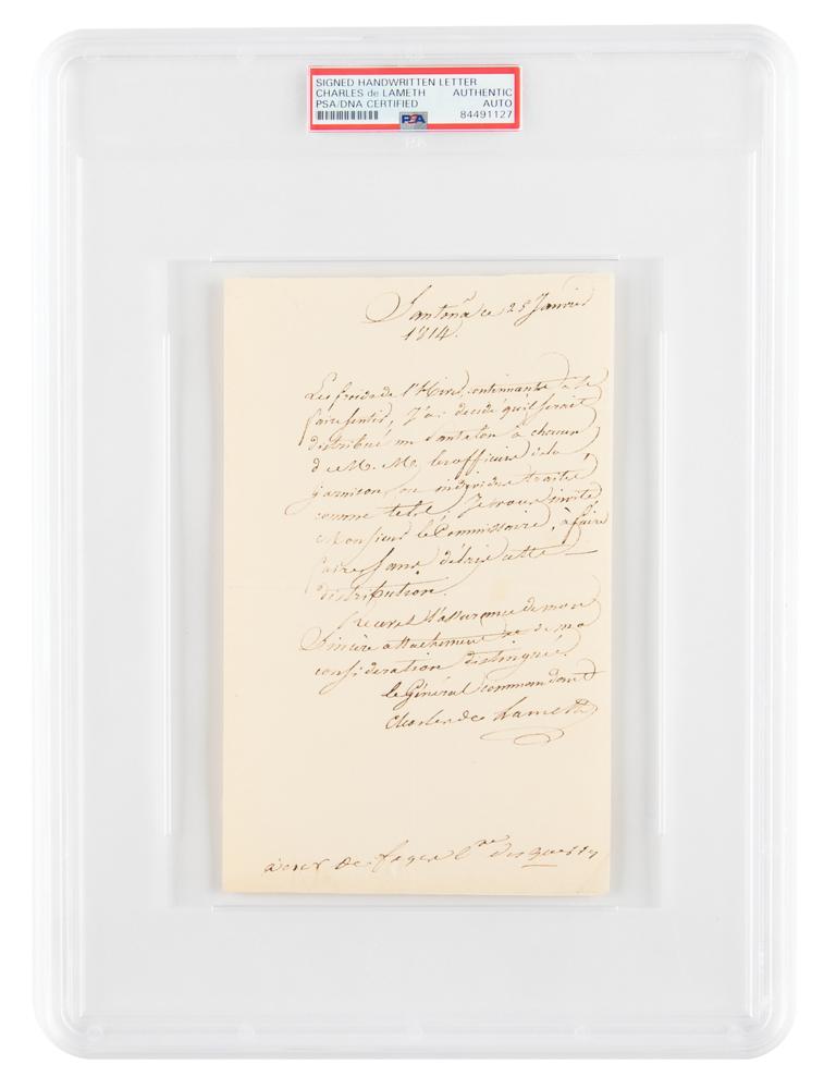 French nobleman and soldier (1757-1832) who was wounded in the Battle of Yorktown during the American Revolution, served as deputy to the Estates-General of 1789 before emigrating to Hamburg during the French Revolution, and returned after Napoleon's amnesty to serve in Spain from 1810 to 1814; his name is inscribed under the Arc de Triomphe. ALS in French, signed “Charles de Lameth,” one page, 5 x 8, January 25, 1814. Untranslated handwritten letter on military matters by Lameth, written from the town of Santoña on the north coast of Spain. In fine condition. Encapsulated in a PSA/DNA authentication holder.